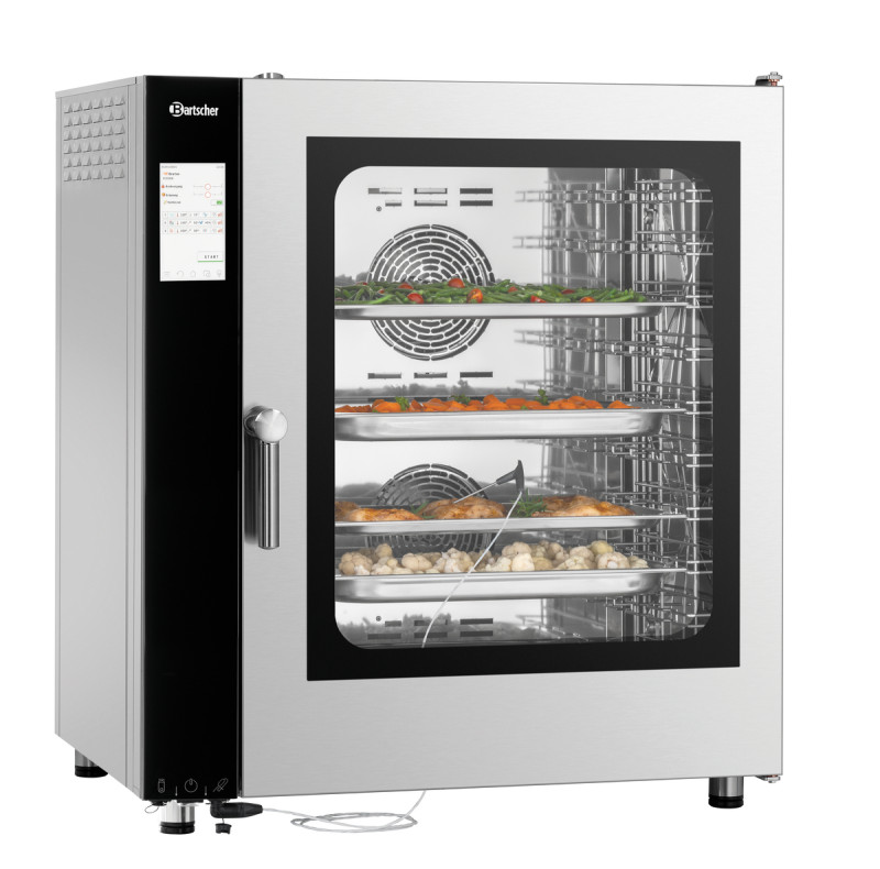 De Bartscher combisteamer Silverstream2 met 10 slots in 1/1 GN-formaat overtuigt door zijn geïntegreerd reinigingssysteem. Met of zonder kerntemperatuurvoeler - de elektronische bediening maakt een op behoeften gebaseerde regeling van alle gaarprocessen mogelijk. Met de rack-controlefunctie kunnen verschillende gerechten met verschillende tijden worden bereid.